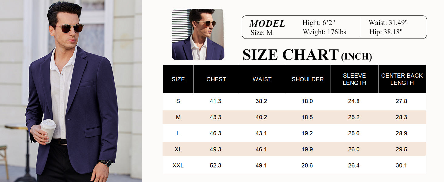• Details: Notch lapel, one chest pocket, two flap pockets and one inner pocket