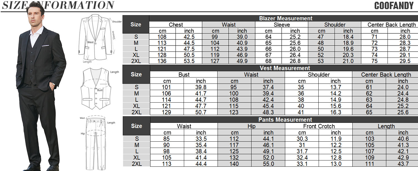 • Package Includes: 1*Blazer, 1*Vest, 1*Suit Pants, 1*Tie