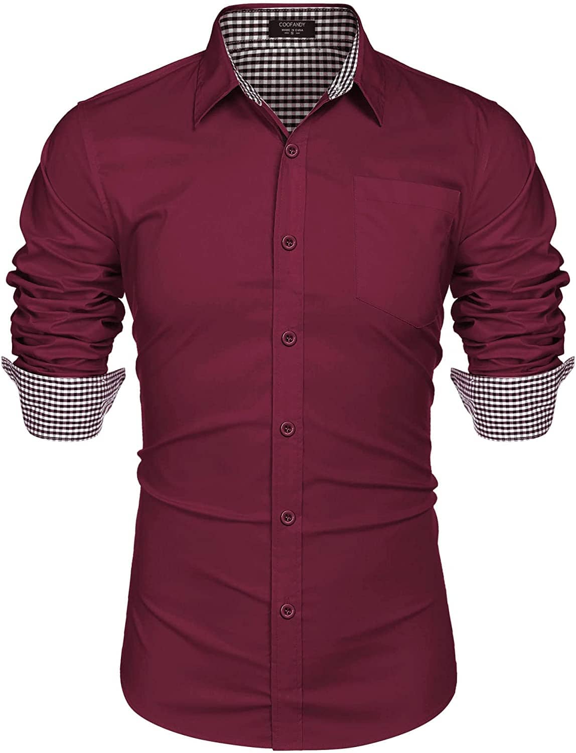 Fashion Design: Men's fashion dress shirt design, regular fit, classic spread collar, button cuffs, solid color, contrasting lining black and white plaid neckline and cuffs, button down long sleeve shirts. Make you handsome and charming, bring sophistication and modernity.