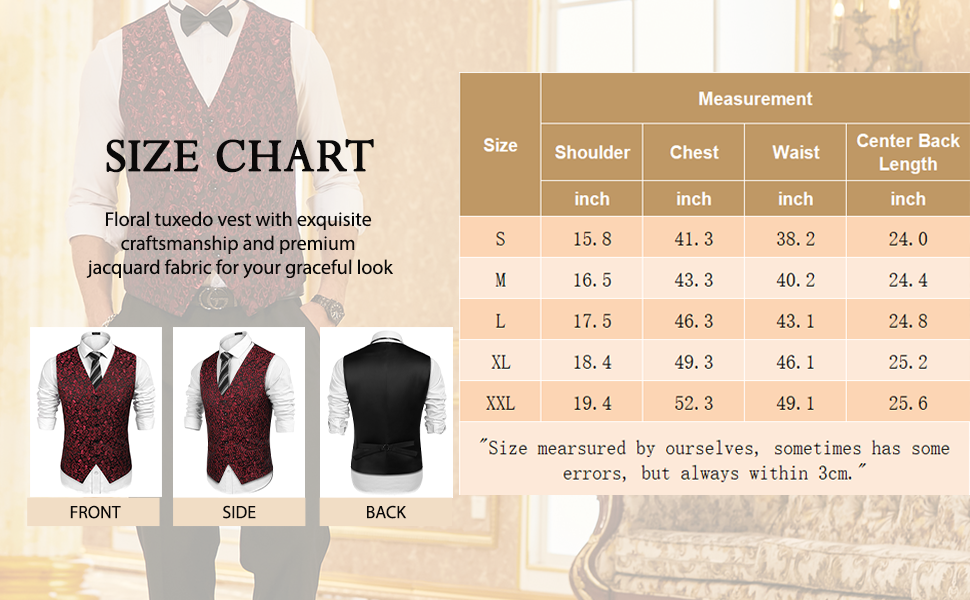 Stylish Design --- Superior jacquard floral embroidered?pattern making the single-breasted tuxedo waistcoat more luxury and decent, adds a unique look to you in the crowd. Adjustable Back Strap, 5 buttons and 2 real pockets will provide more comfortable wearing to you.