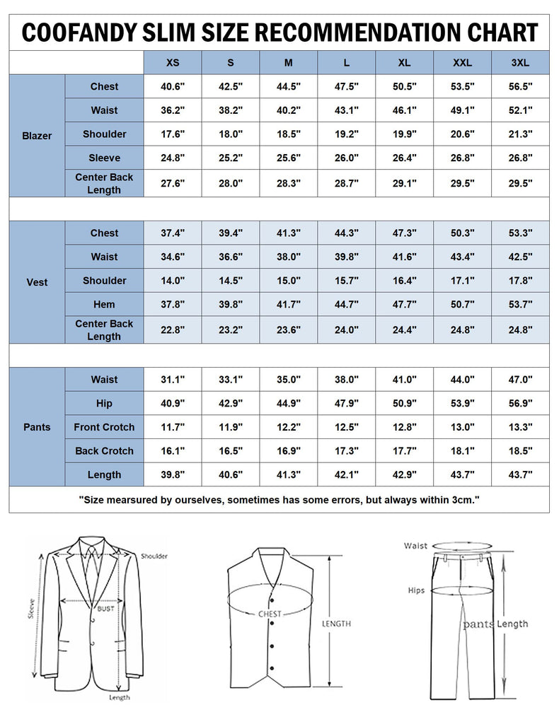 • Package Includes: Blazer*1, Vest*1, Dress Pants*1