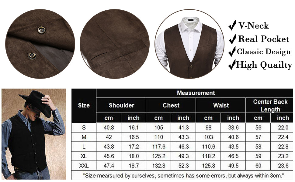 Hand Wash/Dry clean. Notice - When You receive this cowboy vest, the pocket is closed by some stitches. So After Cutting Stitches, You can use pockets. Please read the product size chart carefully before ordering to ensure accurate fitting, if you want loose feeling or you have a big belly or wide chest, advise choosing one size bigger.