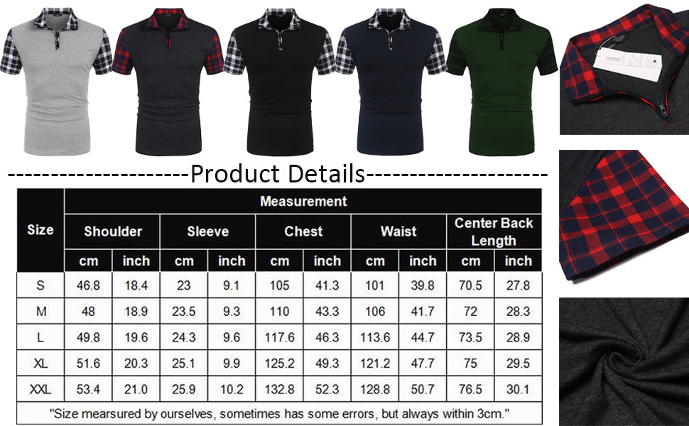 • STYLISH DESIGN: Stylish polo shirts, casual style. Short Sleeve, stitching colors, high quality zip-up placket, plaid patchwork sleeve and collar.
