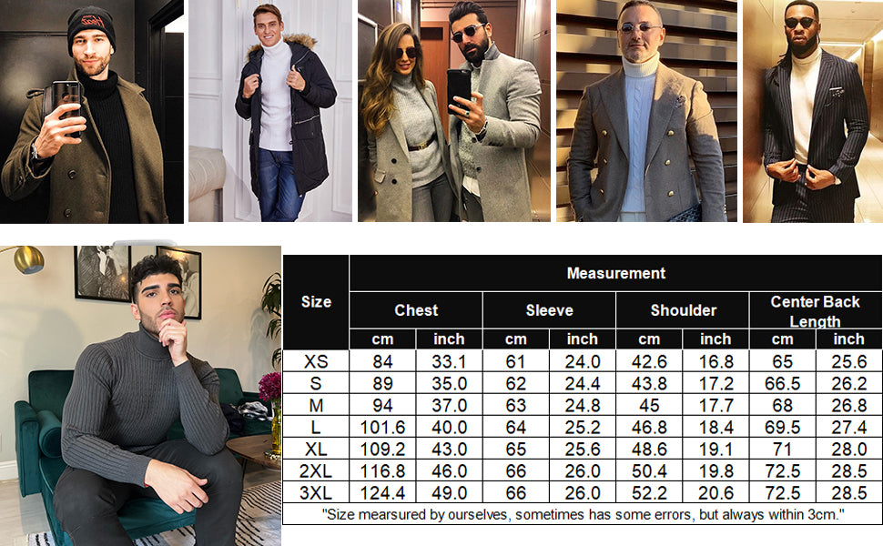 Note - 1-These men's classic turtleneck sweaters are standard US size, go with the size you usually wear, 2-Machine washable.