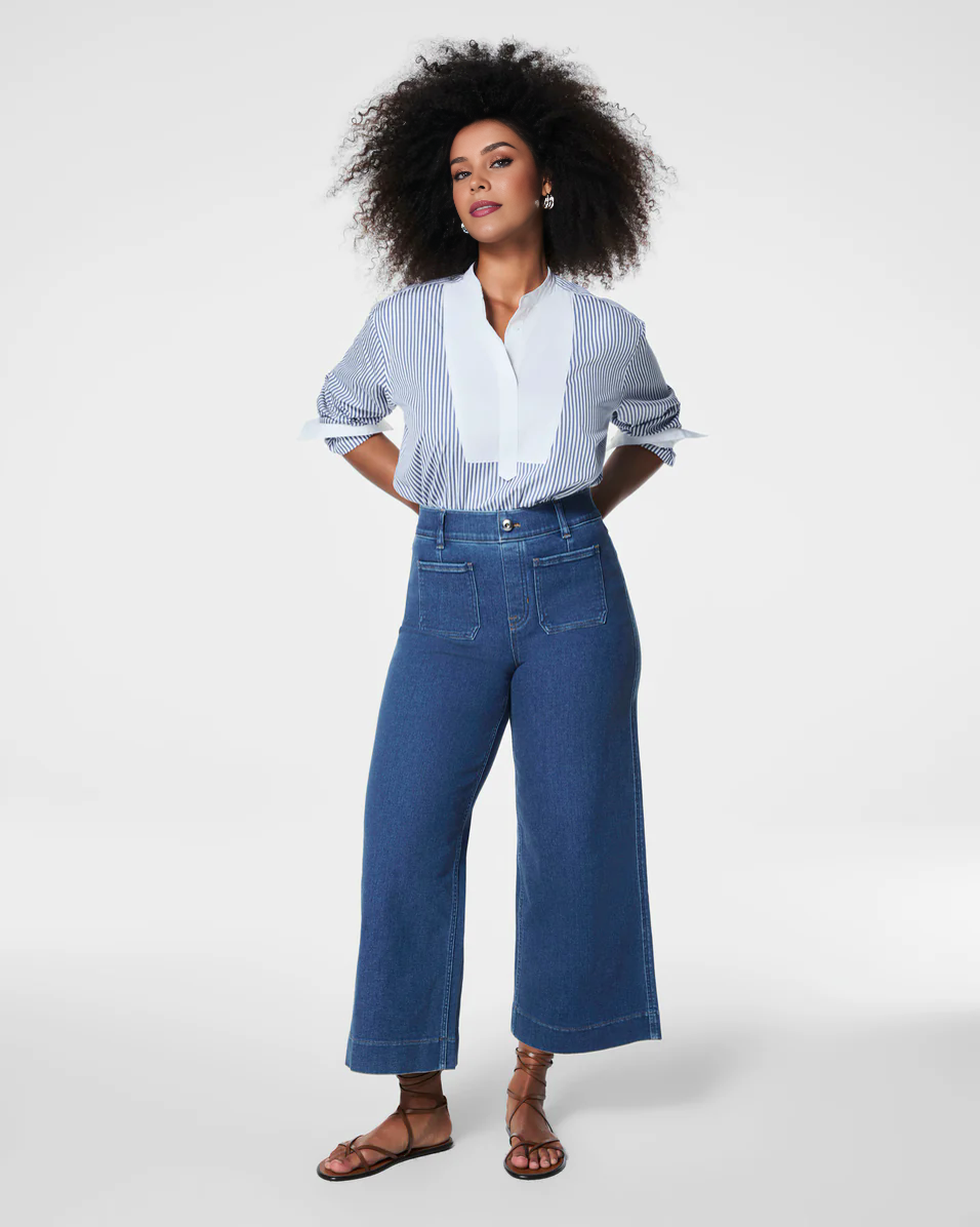Product Description: Experience the beloved retro wide-leg pants style now in a fresh cropped length. These pull-on design denim jeans feature a high-rise waist and come equipped with hidden core shaping technology. Additionally, we've introduced practical patch front pockets for the first time. Crafted from premium stretch denim.